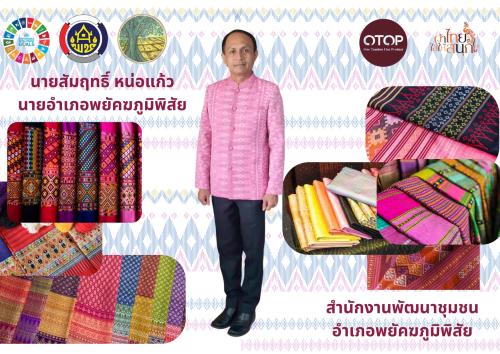นายสัมฤทธิ์ หน่อแก้ว นายอำเภอพยัคฆภูมิพิสัย ร่วมรณรงค์ประชาสัมพันธ์ เชิญชวนทุกท่าน ส่งเสริมการสวมใส่ผ้าไทย เพื่อขับเคลื่อนสู่การสืบสานอนุรักษ์ศิลป์ ผ้าถิ่นไทย ดำรงไว้ในแผ่นดิน “ผ้าไทยใส่ให้สนุก” ตามพระดำริสมเด็จพระเจ้าลูกเธอเจ้าฟ้าสิริวัณณวรี นารีรัตนราชกัญญา และตามมติ ครม. โดยขอเชิญข้าราชการ และองค์กรปกครองส่วนถิ่น กลุ่มองค์กรทุกภาคส่วน กลุ่มองค์กรสตรี แต่งกายด้วยชุดผ้าไทย เพื่อส่งเสริมและเผยแพร่อัตลักษณ์ผ้าไทยให้ดำรงคงอยู่ “งามอย่างไทย ตามแบบวิถีไทย”